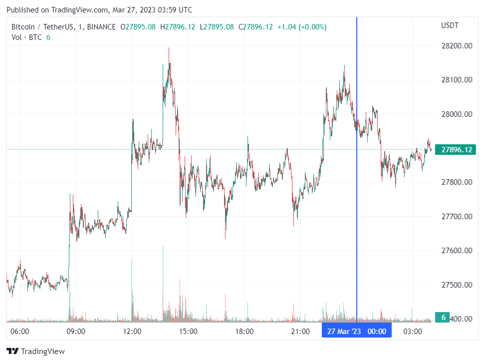 Биткоин (BTC), по данным ресурса CoinMarketCap, начал понедельник с падения. По состоянию на 07:00 (МСК), криптовалюта торгуется по $27 896 (1 токен в рублях — ₽2,143,214). Минимум биткоина за 24 часа — $27 497, максимум — $28 178.