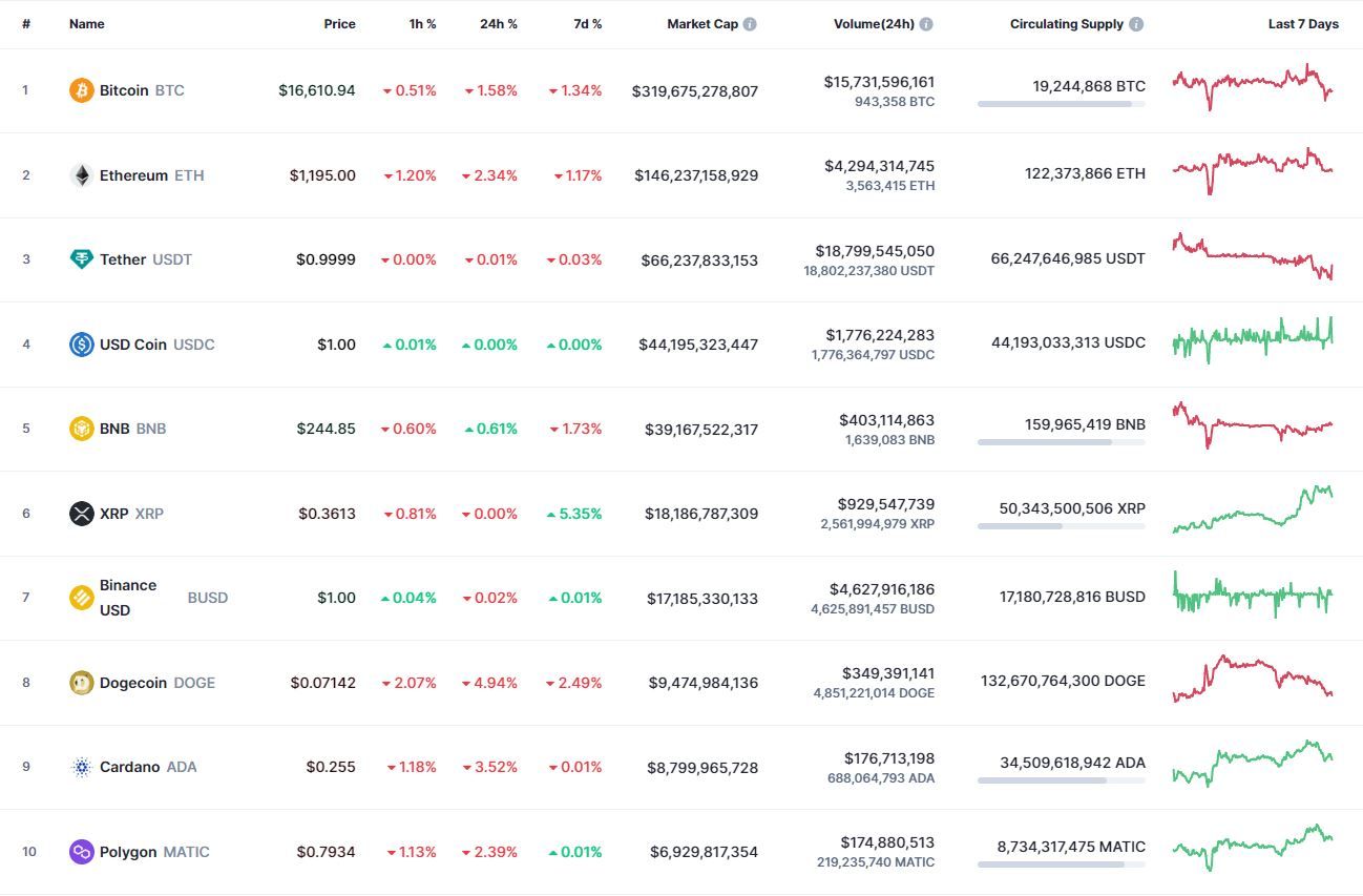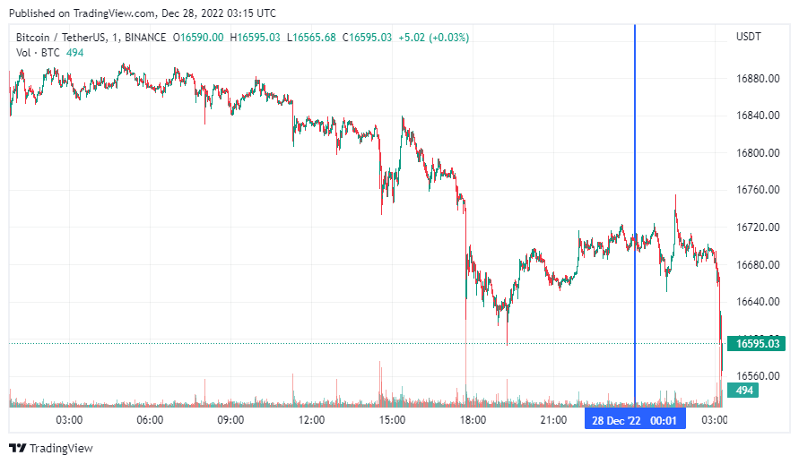 Биткоин (BTC), по данным ресурса CoinMarketCap, начал среду с боковика, который перешел в падение. По состоянию на 06:16 (МСК), криптовалюта торгуется по $16 595 (1 токен в рублях – ₽1,164,056). Максимум биткоина за 24 часа – $16 895, минимум монета обновляет в момент написания обзора.