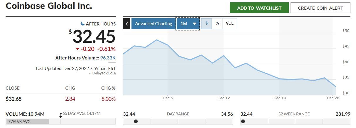 - Акции одной из крупнейших криптобирж Coinbase обновили абсолютный минимум на уровне $32.44. За месяц ценные бумаги торговой платформы подешевели на 23.19%, а за год – на 88.35%.