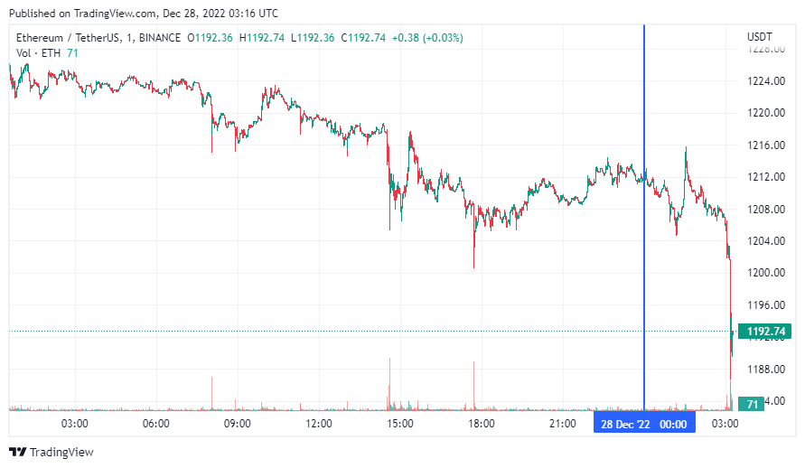 Вторая по капитализации криптовалюта Ethereum также начала день с боковика, который перешел в падение. По состоянию на момент написания обзора, монета торгуется по $1192 (1 токен в рублях – ₽83,769).