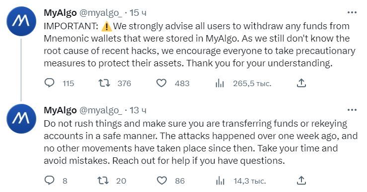 - Хакеры взломали кошелек для экосистемы Algorand, который также выступает шлюзом для децентрализованных приложений – MyAglo. Информация о прорыве систем безопасности появилась в микроблоге проекта. Разработчики посоветовали пользователям вывести все средства из мнемонического кошелька.