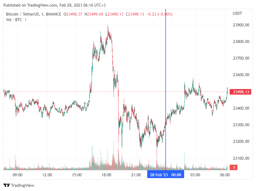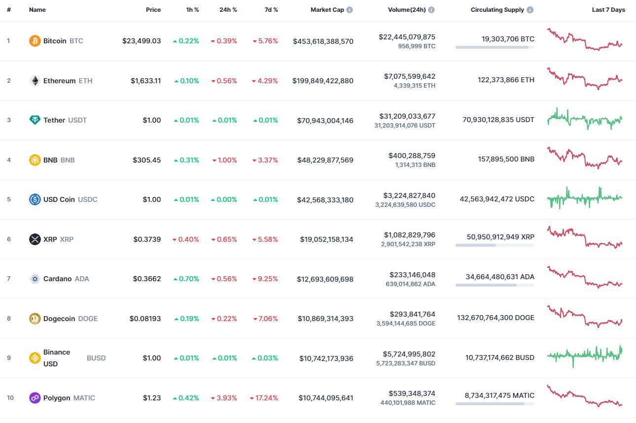 Биткоин (BTC), по данным ресурса CoinMarketCap, начал вторник с роста. По состоянию на 06:17 (МСК), криптовалюта торгуется по $23 498 (1 токен в рублях – ₽1,753,004). Минимум биткоина за 24 часа – $23 205, максимум – $23 857.