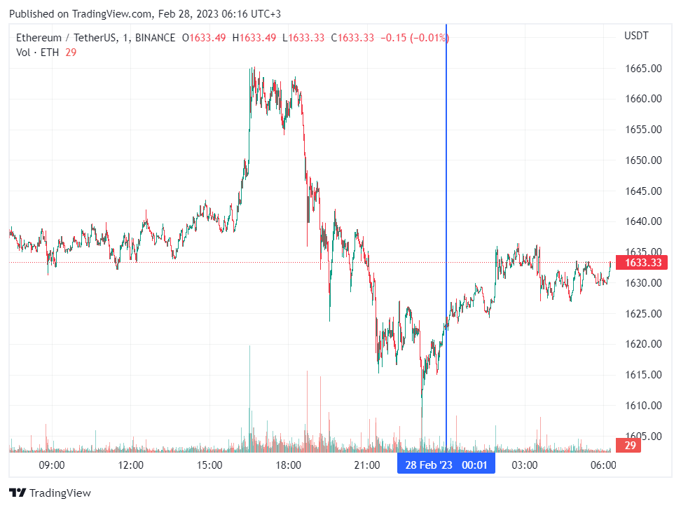 Вторая по капитализации криптовалюта Ethereum также начала день с роста. По состоянию на момент написания обзора, монета торгуется по $1633 (1 токен в рублях – ₽121,872).