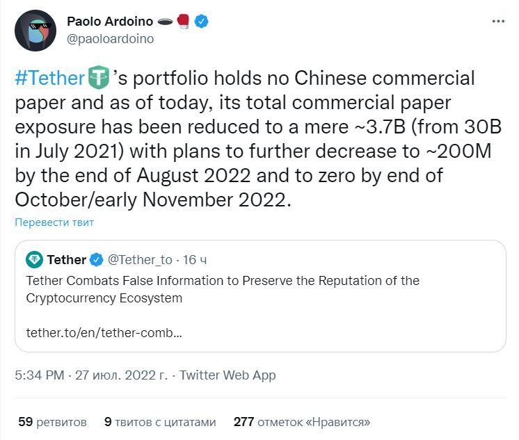 По словам представителей компании, доля коммерческих бумаг, которая составляет $3,7 млрд, будет сведена к нулю. В качестве дедлайна технический директор Tether обозначил ноябрь 2022 года. Также представители проекта обратили внимание на то, что в портфеле обеспечения Tether нет ценных бумаг китайских компаний.