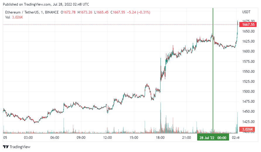 SponsoredВторая по капитализации криптовалюта Ethereum также начала день со вспышки роста. По состоянию на момент написания обзора, монета торгуется по $1667.