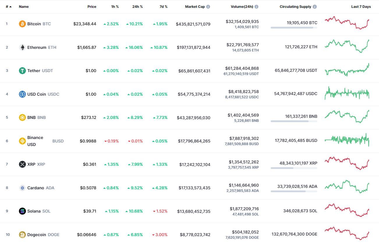 Биткоин (BTC), по данным ресурса CoinMarketCap, начал четверг со вспышки роста. По состоянию на 05:50 (МСК), криптовалюта торгуется по $23 402. Минимум стоимости монеты за 24 часа зафиксирован на уровне $21 070, максимум монета обновляет в момент написания новости.