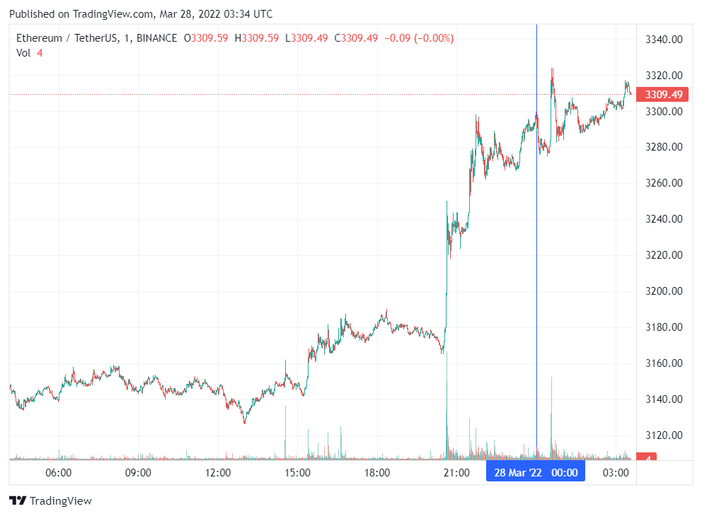 Вторая по капитализации криптовалюта Ethereum также начала понедельник с роста. По состоянию на момент написания новости монета торгуется по $3309.