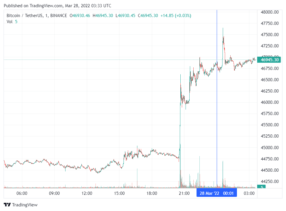 Биткоин (BTC) начал новую рабочую неделю со вспышки роста. По состоянию на 06:34 (МСК), криптовалюта торгуется по $46 945. Минимум стоимости биткоина за 24 часа, по данным ресурса CoinGecko, зафиксирован на уровне $44 413, максимум – на высоте $47 118.