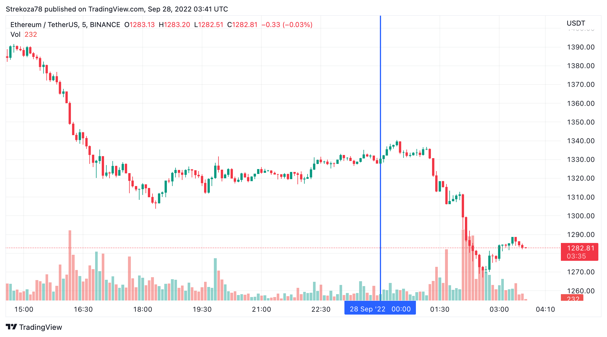 Вторая по капитализации криптовалюта Ethereum утром в среду, 28 сентября, подешевела почти на $70 и протестировала локальный минимум на уровне $1 267, потеряв таким образом все позиции, которые удалось набрать в начале недели. По состоянию на момент написания обзора монета торгуется по $1 282 (1 токен в рублях – ₽75 743).