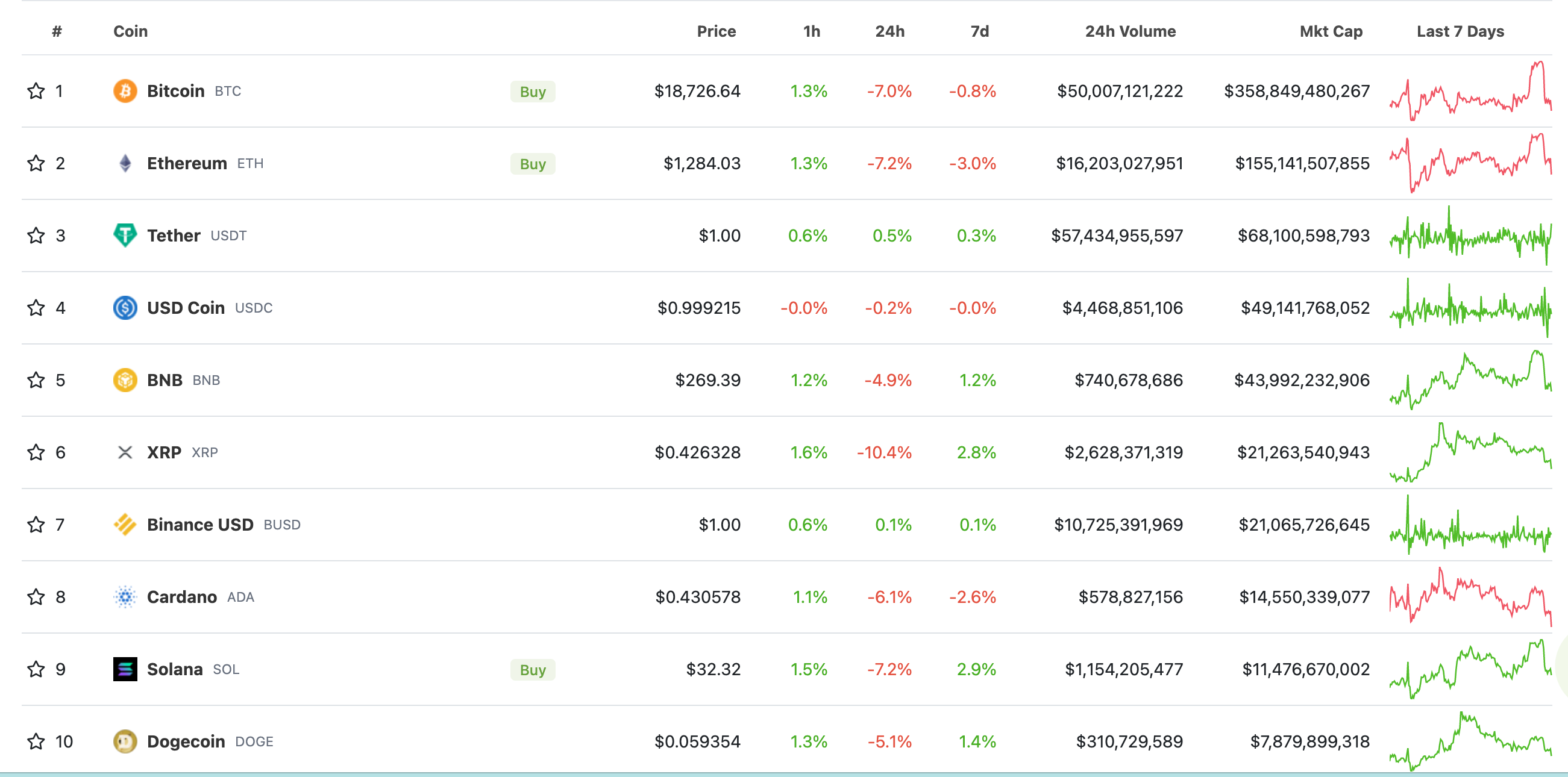 В топ-10 самых капитализированных криптовалют за сутки все монеты кроме стейблкоинов находятся в минусе. В недельном исчислении лучше всех обстоят дела у Solana (SOL). За семь дней токен вырос на 2,9%. Худший результат за 24 часа (-10,4%) показал токен Ripple (XRP). За неделю – ETH, потерявший 3%.