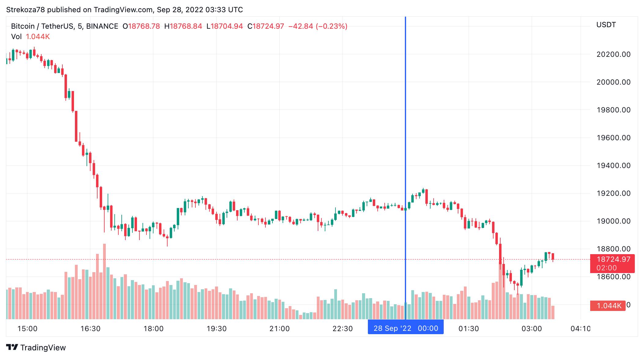 В среду утром, 28 сентября, курс биткоина (BTC) восстановился от внутридневного минимумам в области $18 471, но вернуться в область выше $19 000 так и не смог. Первая криптовалюта за сутки потеряла 7,5% стоимости. По состоянию на 06:35 (МСК), BTC торгуется по $18724 (1 токен в рублях – ₽1 103 783). Минимум биткоина за 24 часа – $18 432, максимум – $20 338.