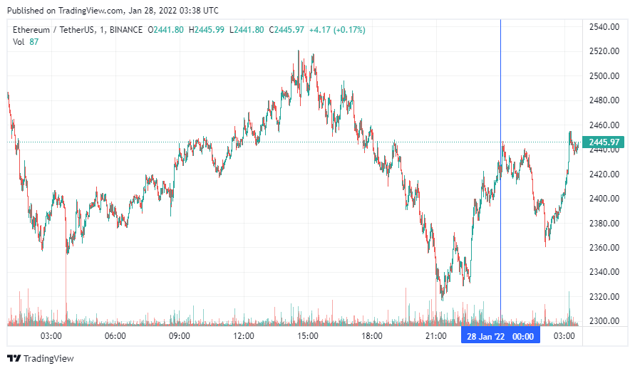 Вторая по капитализации криптовалюта Ethereum также начала день с бокового движения. По состоянию на момент написания новости, монета торгуется по $2445.