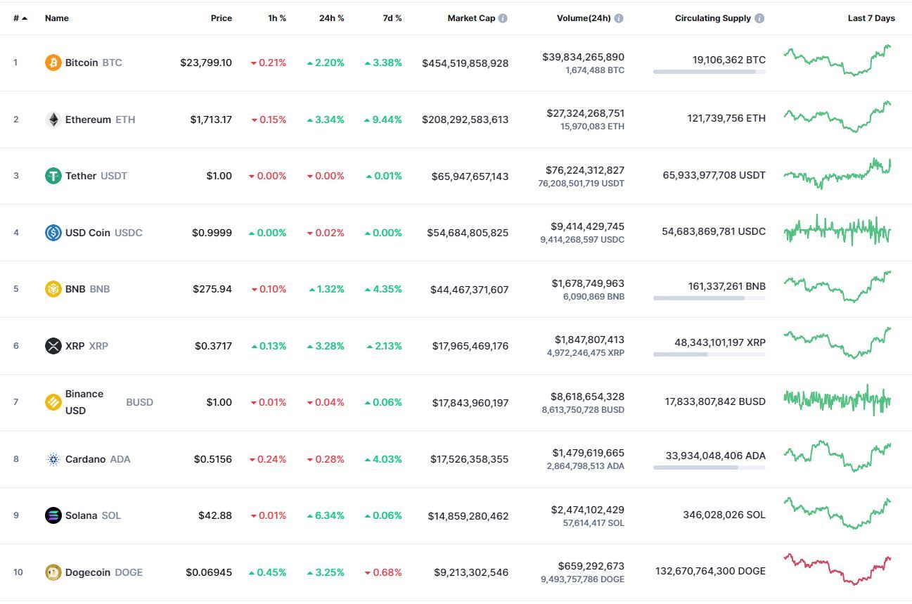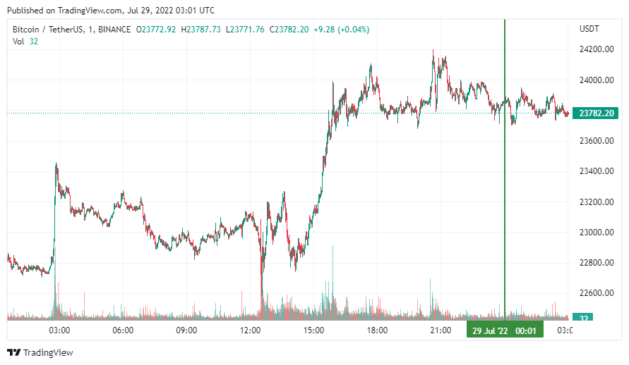 Биткоин (BTC), по данным ресурса CoinMarketCap, начал пятницу с бокового движения. По состоянию на 06:02 (МСК), криптовалюта торгуется по $23 782. Минимум стоимости монеты за 24 часа зафиксирован на уровне $22 722, максимум – на высоте $24 110.