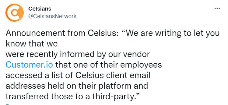 По данным Celsius, виновником утечки стал вендор платформы – компания Customer. Один из сотрудников организации получил доступ к списку e-mail адресов клиентов кредитной платформы и передал его третьей стороне. Мошенники могут использовать адреса электронной почты пользователей Celsius для организации фишинговых атак.
