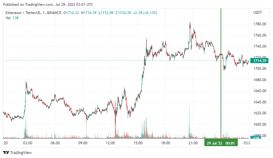 SponsoredВторая по капитализации криптовалюта Ethereum также начала день с бокового движения. По состоянию на момент написания новости, монета торгуется по $1714.