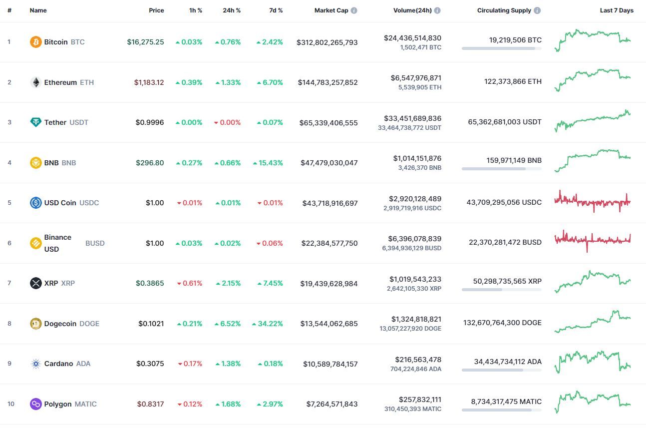 В топ-10 самых капитализированных криптовалют лучший результат за сутки (+6,52%) и неделю (+34,22%) зафиксирован у Dogecoin. В рамках 24 часов и последних семи дней все монеты, за исключением ряда стейблкоинов, демонстрировали позитивную динамику.