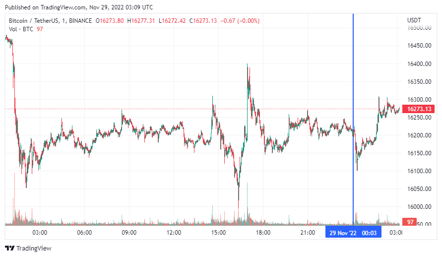 Биткоин (BTC), по данным ресурса CoinMarketCap, начал вторник с небольшого снижения, которое перешло в рост. По состоянию на 06:10 (МСК), криптовалюта торгуется по $16 273 (1 токен в рублях – ₽992,755). Минимум биткоина за 24 часа – $16 054, максимум – $16 358.