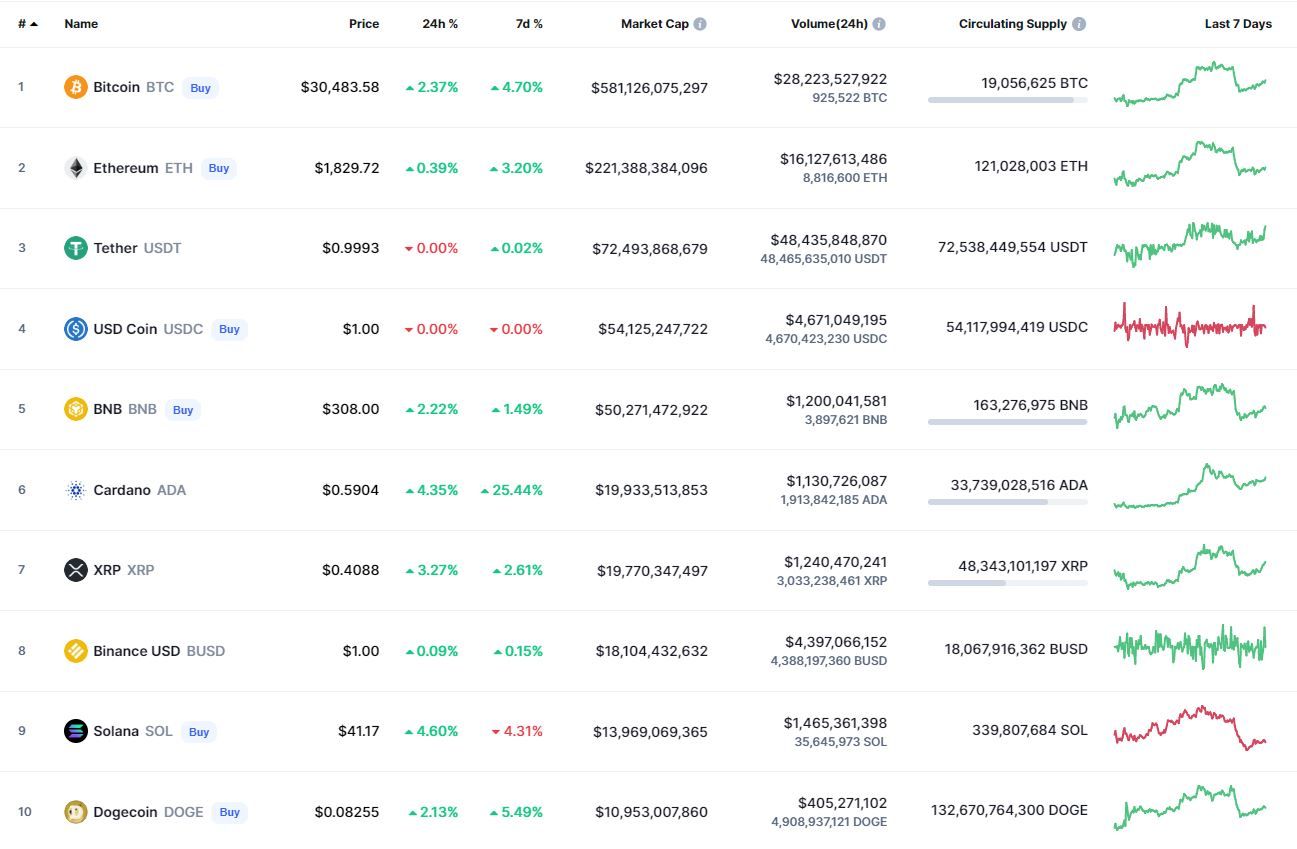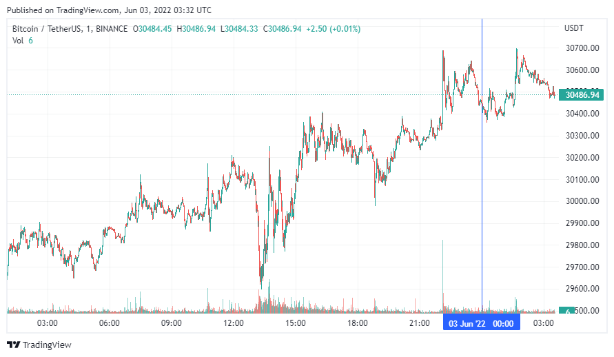 Биткоин (BTC) начал день с боковика. По данным CoinMarketCap, по состоянию на 06:33 (МСК), криптовалюта торгуется по $30 486. Минимум стоимости монеты за 24 часа зафиксирован на уровне $29 688, максимум – на высоте $30 633.