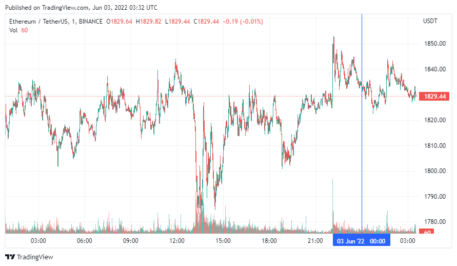 Вторая по капитализации криптовалюта Ethereum также начала день с боковика. По состоянию на момент написания новости, монета торгуется по $1829.
