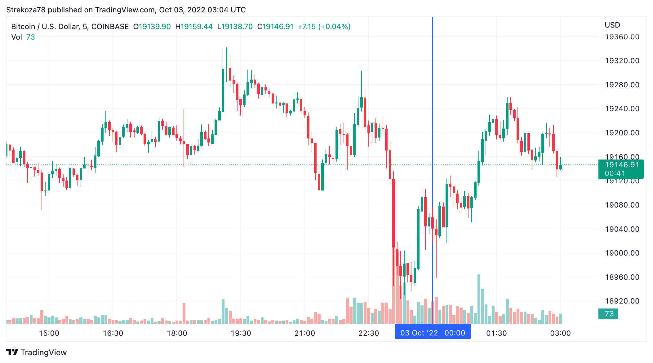 Курс биткоина (BTC) восстановился над отметкой $19 000 после кратковременного падения вечером в воскресенье, 2 октября. На момент публикации криптовалюта торгуется на уровне $19 460, практически не изменившись в суточном исчислении. (1 токен в рублях – ₽1 153 913). Минимум биткоина за 24 часа – $18 928, максимум – $19 377.