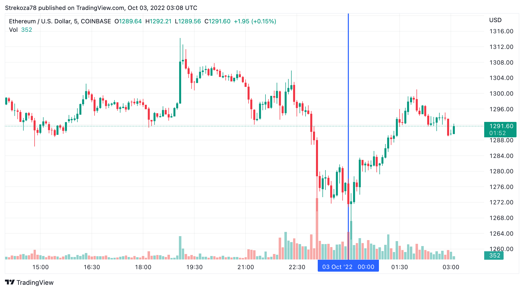 Вторая по капитализации криптовалюта Ethereum утром в понедельник, 3 октября, протестировала локальный минимум на уровне $1 262. По состоянию на момент написания обзора монета торгуется по $1 291 (1 токен в рублях – ₽77 717).