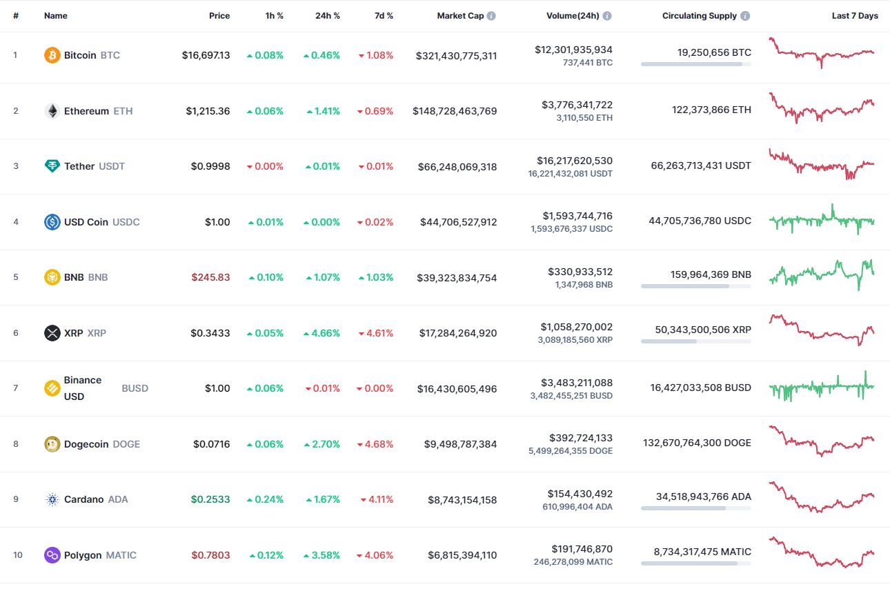 Биткоин (BTC), по данным ресурса CoinMarketCap, начал вторник с боковика. По состоянию на 06:49 (МСК), криптовалюта торгуется по $16 693(1 токен в рублях – ₽1,185,401). Минимум биткоина за 24 часа – $16 635, максимум – $16 759.