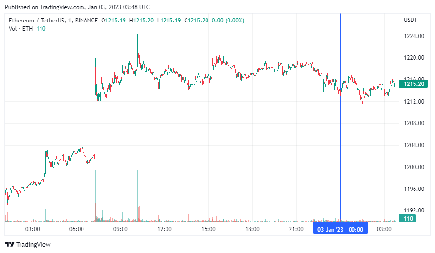 Вторая по капитализации криптовалюта Ethereum также начала день с боковика. По состоянию на момент написания обзора, монета торгуется по $1215 (1 токен в рублях – ₽86,311).