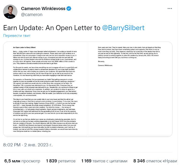 - Соучредитель криптобиржи Gemini Кемерон Уинклвосс потребовал от главы компании Digital Currency Group (DCG) Барри Силберта объяснения продолжительного удержания клиентских денег на счетах подконтрольного ему криптоброкера Genesis. Свои претензии бизнесмен выразил в открытом письме 2 января 2023 года. Соучредитель криптобиржи попросил Силберта найти решение проблемы до 8 января 2023 года.