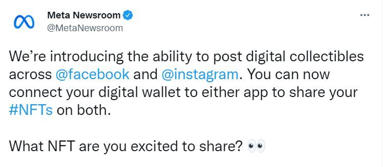 Sponsored- Признанная в РФ экстремистской организация Meta (бывший Facebook) расширила пилотный проект по интеграции невзаимозаменяемых токенов (NFT) в подконтрольные компании социальные сети. Информация об этом появилась в микроблоге платформы.