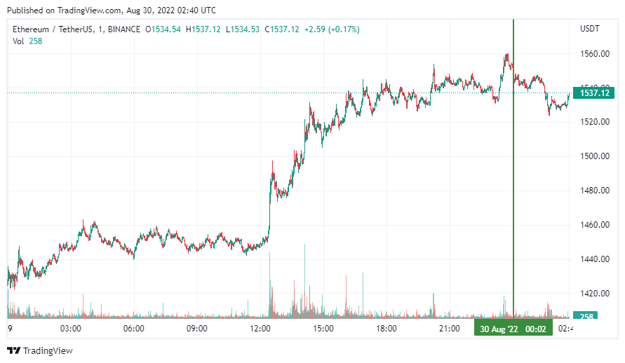 Вторая по капитализации криптовалюта – Ethereum – также начала день с боковика. По состоянию на момент написания обзора, монета торгуется по $1537 (1 токен в рублях – ₽94,962).