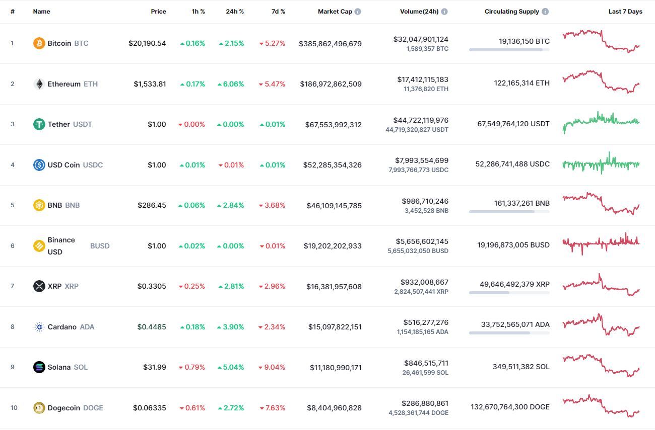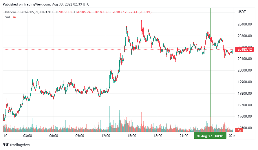 Биткоин (BTC), по данным ресурса CoinMarketCap, начал вторник с бокового движения. По состоянию на 05:40 (МСК), криптовалюта торгуется по $20 183 (1 токен в рублях – ₽1,246,989). Минимум биткоина за 24 часа – $19 756, максимум – $20 357.
