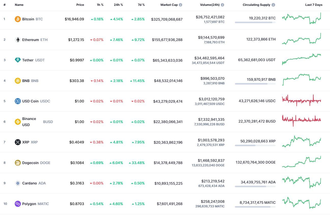 В топ-10 самых капитализированных криптовалют лучший результат за сутки зафиксирован у Ethereum (+7,46%), за неделю – у Dogecoin (+33,48%). В рамках 24 часов и последних семи дней все монеты из первой десятки, за исключением стейблкоина USD Coin, продемонстрировали позитивную динамику.