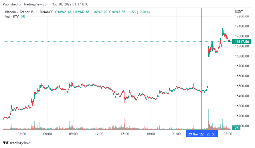 Биткоин (BTC), по данным ресурса CoinMarketCap, начал среду с роста. По состоянию на 06:18 (МСК), криптовалюта торгуется по $16 947 (1 токен в рублях – ₽1,031,020). Минимум биткоина за 24 часа – $16 281, максимум – $17 021.