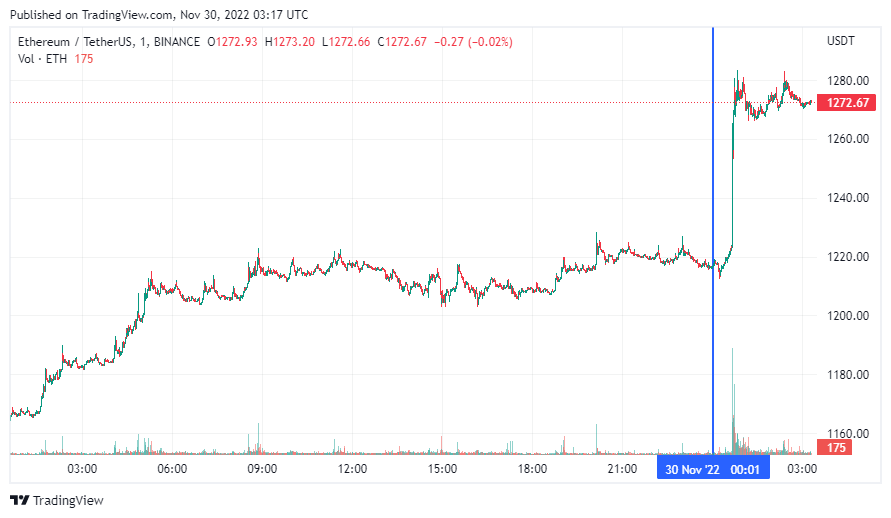 Вторая по капитализации криптовалюта Ethereum также начала день с роста. По состоянию на момент написания обзора, монета торгуется по $1272 (1 токен в рублях – ₽77,413).