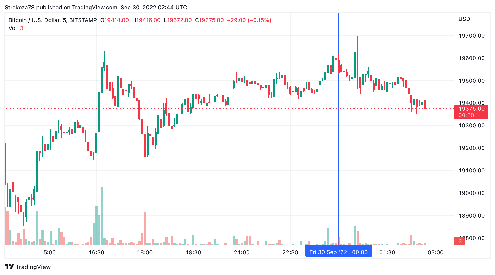 В пятницу утром, 30 сентября, курс биткоина (BTC) торгуется в середине диапазона $19 000-$20 000. Первая криптовалюта сутки почти не изменилась в цене. По состоянию на 05:50 (МСК), криптовалюта торгуется по $19 375 (1 токен в рублях – ₽1 132 381).