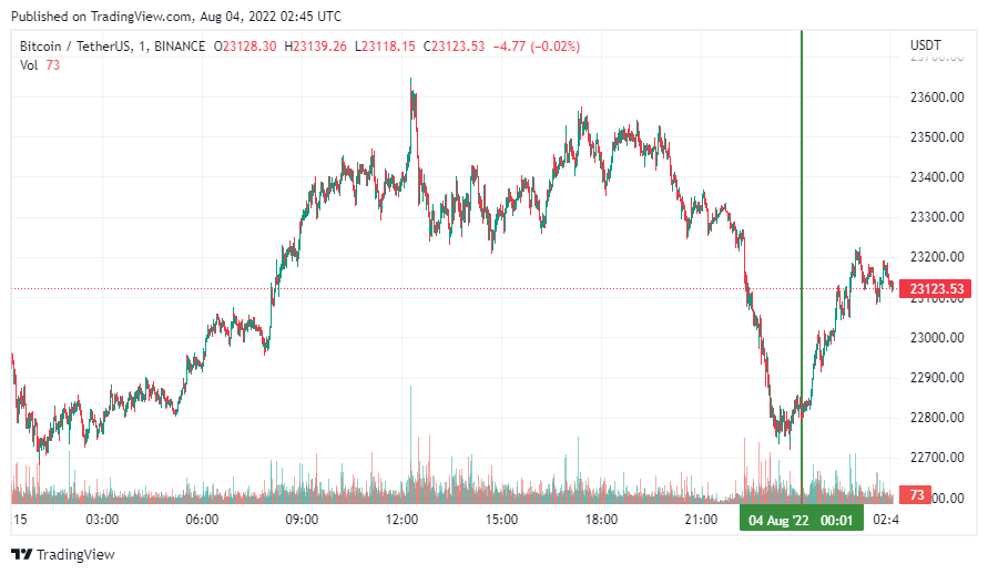 Биткоин (BTC), по данным ресурса CoinMarketCap, начал четверг с роста. По состоянию на 05:47 (МСК), криптовалюта торгуется по $23 123. Минимум стоимости биткоина за 24 часа зафиксирован на уровне $22 790, максимум – на высоте $23 578.