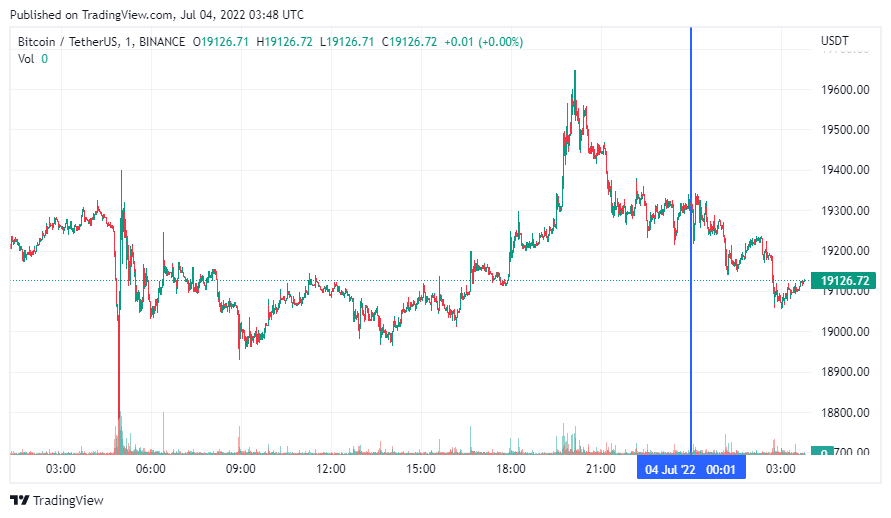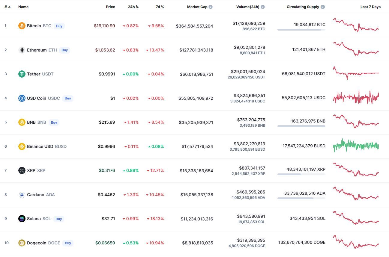 Биткоин (BTC), по данным ресурса CoinMarketCap, начал новую рабочую неделю с падения. По состоянию на 06:49 (МСК), криптовалюта торгуется по $19 126. Минимум стоимости монеты за 24 часа зафиксирован на уровне $18 966, максимум – на высоте $19 558.