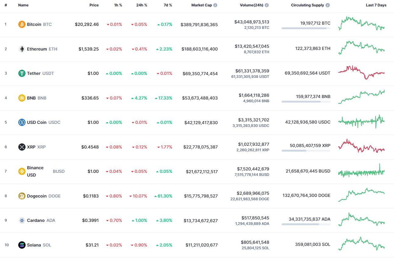 Биткоин (BTC), по данным ресурса CoinMarketCap, начал пятницу с небольшого роста. По состоянию на 06:12 (МСК), криптовалюта торгуется по $20 284 (1 токен в рублях – ₽1,260,574). Минимум биткоина за 24 часа – $20 086, максимум – $20 382.
