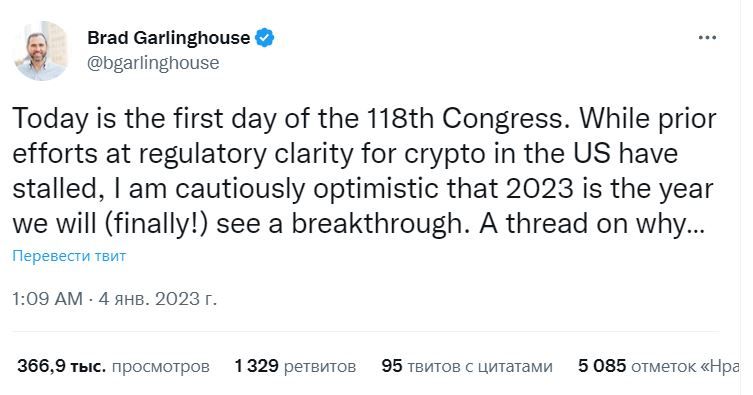 По мнению главы Ripple, 2023 год может оказаться прорывным в вопросах формирования правовой ясности для криптоиндустрии. Брэд Гарлингхасу отметил, что он поддерживает «двухпартийное и двухпалатное регулирование» рынка.