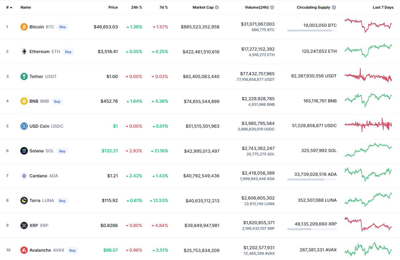Биткоин (BTC) начал вторник с бокового движения. По состоянию на 06:02 (МСК), криптовалюта торгуется по $46 655. Минимум стоимости монеты за 24 часа, по данным ресурса CoinMarketCap, зафиксирован на уровне $45 235, максимум – на высоте $46 791.