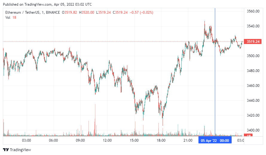 Вторая по капитализации криптовалюта Ethereum также начала день с боковика. По состоянию на момент написания новости, монета торгуется по $3519.