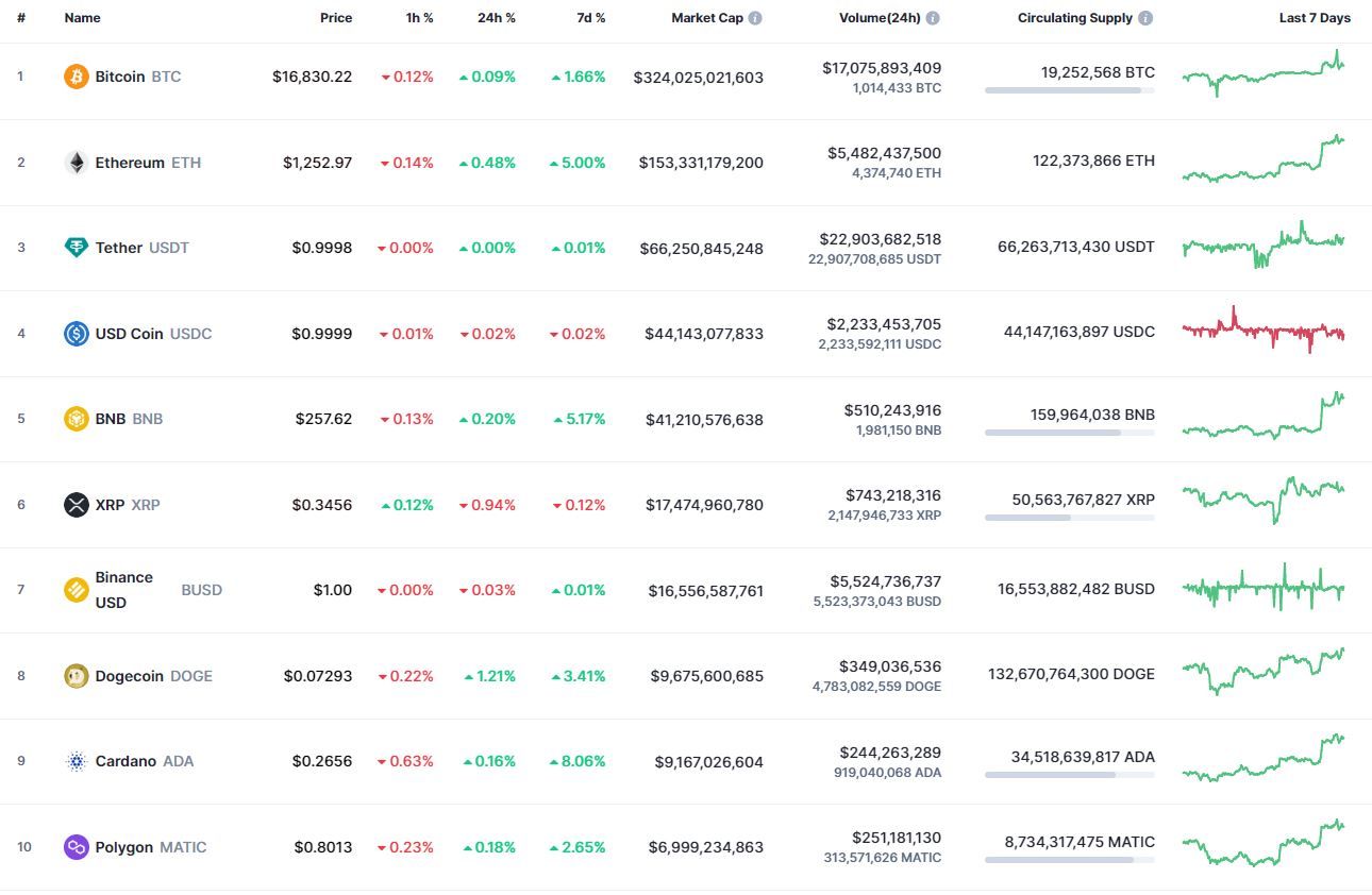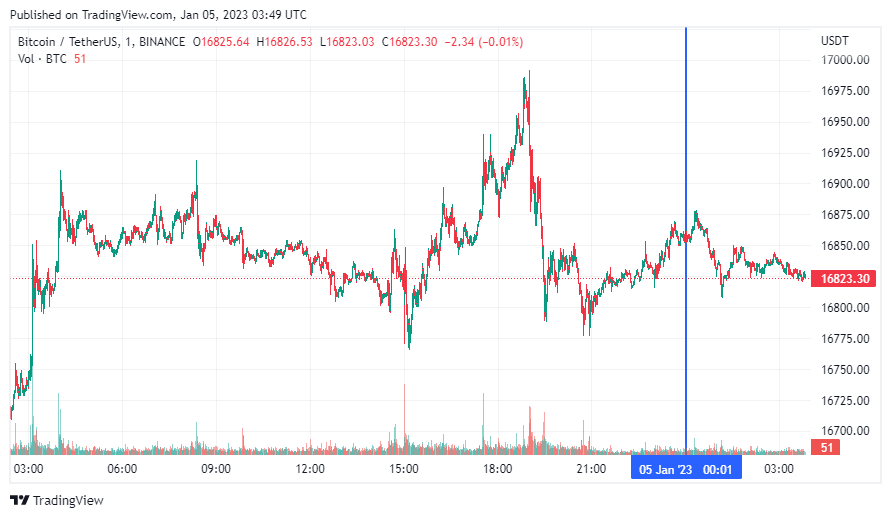 Биткоин (BTC), по данным ресурса CoinMarketCap, начал день с бокового движения. По состоянию на 06:50 (МСК), криптовалюта торгуется по $16 823 (1 токен в рублях – ₽1,203,038). Минимум биткоина за 24 часа – $16 789, максимум – $16 964.