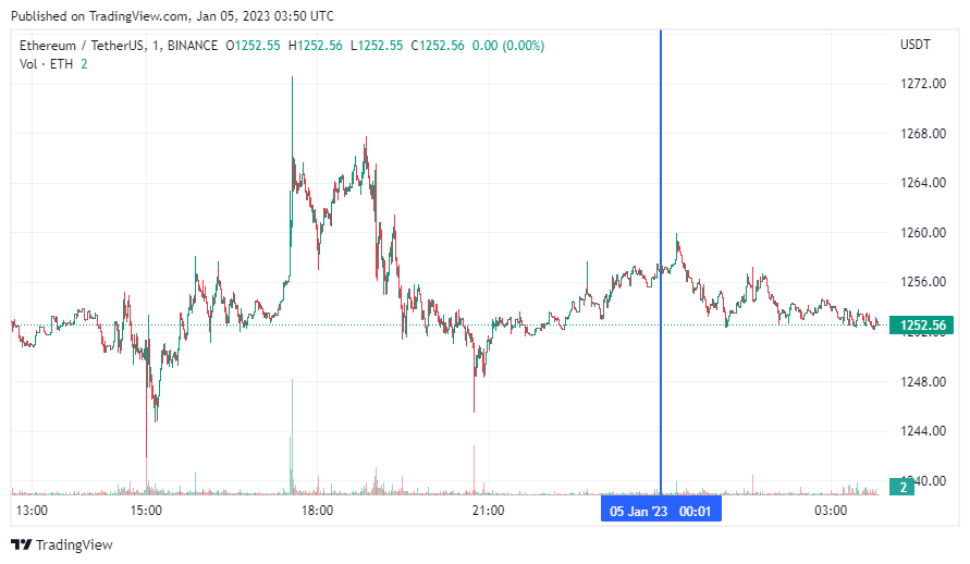 Вторая по капитализации криптовалюта Ethereum также начала день с боковика. По состоянию на момент написания обзора, монета торгуется по $1252 (1 токен в рублях – ₽89,573).