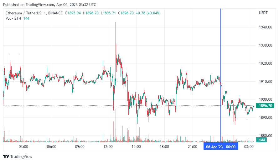 Вторая по капитализации криптовалюта Ethereum также начала день с падения. По состоянию на момент написания обзора, монета торгуется по $1896 (1 токен в рублях — ₽152,173).