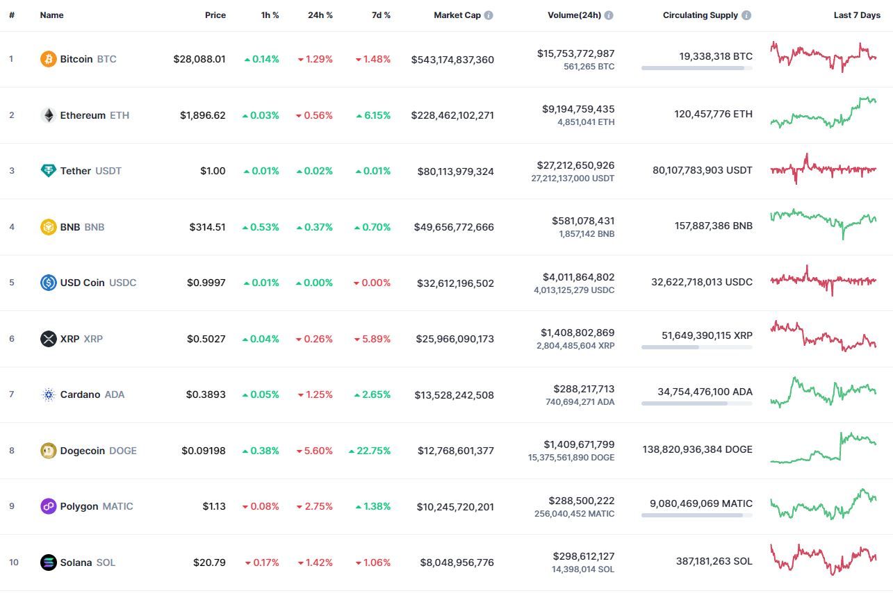 Биткоин (BTC), по данным ресурса CoinMarketCap, начал четверг с падения. По состоянию на 06:33 (МСК), криптовалюта торгуется по $28 071 (1 токен в рублях — ₽2,252,861). Минимум биткоина за 24 часа — $27 843, максимум — $28 714.