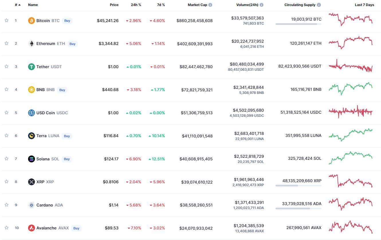 В топ-10 самых капитализированных криптовалют лучший результат за 24 часа зафиксирован у Terra (+0,70%). Лучший результат за неделю продемонстрировал Solana (+12,51%). Наибольшие потери за сутки зафиксированы у Avalanche (-7,10%). В рамках недели активнее других терял в цене XRP (-5,96%).