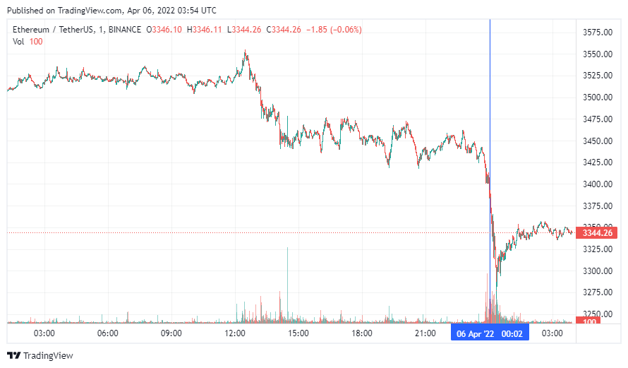 Вторая по капитализации криптовалюта Ethereum также начала день с падения, которое перешло в коррекцию. По состоянию на момент написания новости монета торгуется по $3344.