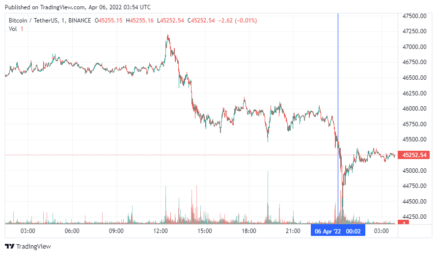 Биткоин (BTC) начал среду с падения, которое перешло в коррекцию. По состоянию на 06:55 (МСК), криптовалюта торгуется по $45 252. Минимум стоимости монеты за 24 часа, по данным ресурса CoinMarketCap, зафиксирован на уровне $44 669, максимум – на высоте $47 106.
