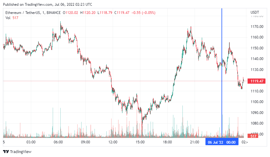 Вторая по капитализации криптовалюта Ethereum также начала день с падения. По состоянию на момент написания обзора, монета торгуется по $1119.