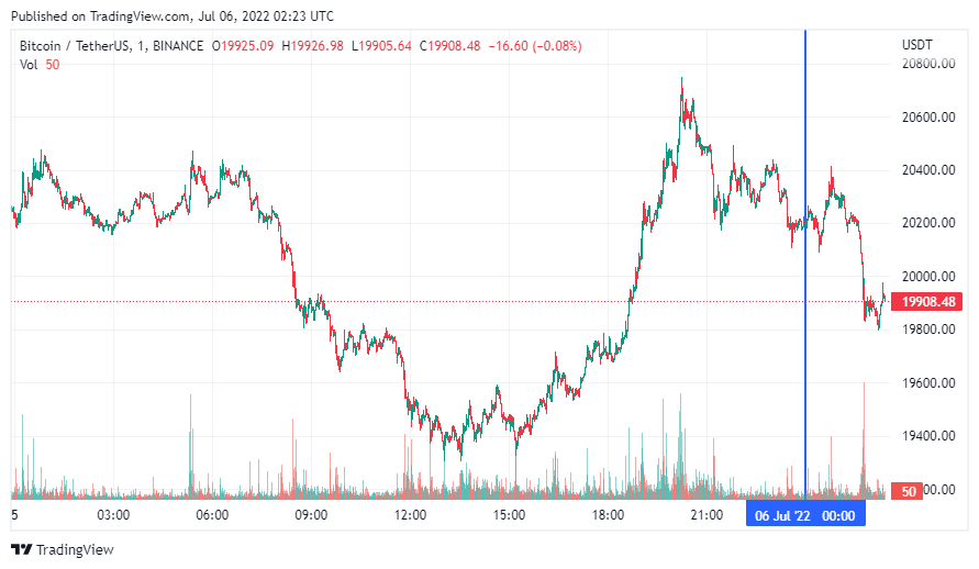 Биткоин (BTC), по данным ресурса CoinMarketCap, начал среду с небольшого падения. По состоянию на 05:24 (МСК), криптовалюта торгуется по $19 908. Максимум BTC за 24 часа зафиксирован на уровне $20 635, минимум монета обновляет в момент написания обзора.